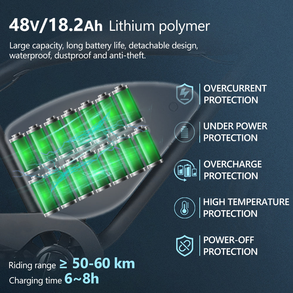 • 48V 18.2Ah Battery – Enjoy extended rides with a max range of 37 miles on a single charge.